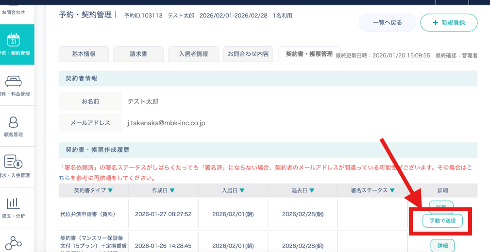 6.一覧に戻るボタンをクリックし、作成した契約書・帳票作成履歴を表示した後、作成した代位弁済申請データの右の[手動で送信]ボタンをクリックします。
