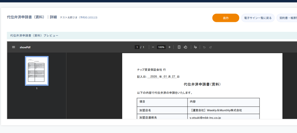 契約書・帳票作成履歴を表示した後、作成した代位弁済申請データの右の[詳細]ボタンを押すと申請内容がPDF化されたものが表示されます。